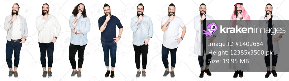 Collage of young man with beard and long hair over white isolated background looking confident at the camera with smile with crossed arms and hand raised on chin. Thinking positive. - Kraken Images