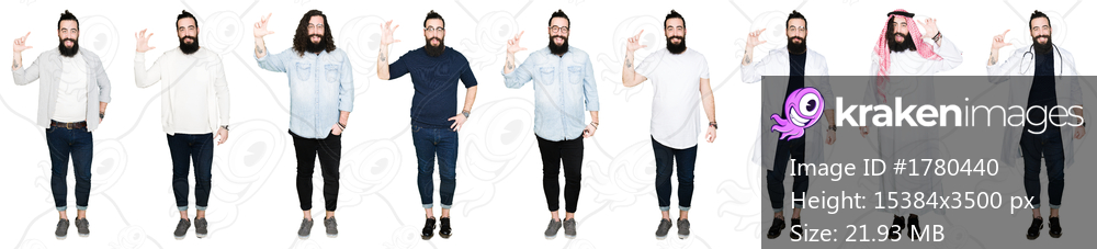 Collage of young man with beard and long hair over white isolated background smiling and confident gesturing with hand doing size sign with fingers while looking and the camera. Measure concept. - Kraken Images