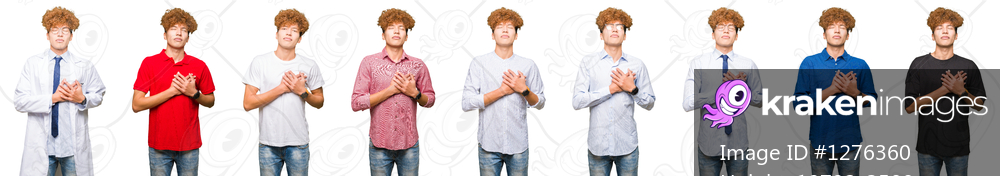 Collage of young man wearing different looks over isolated white background smiling with hands on chest with closed eyes and grateful gesture on face. Health concept. - Kraken Images