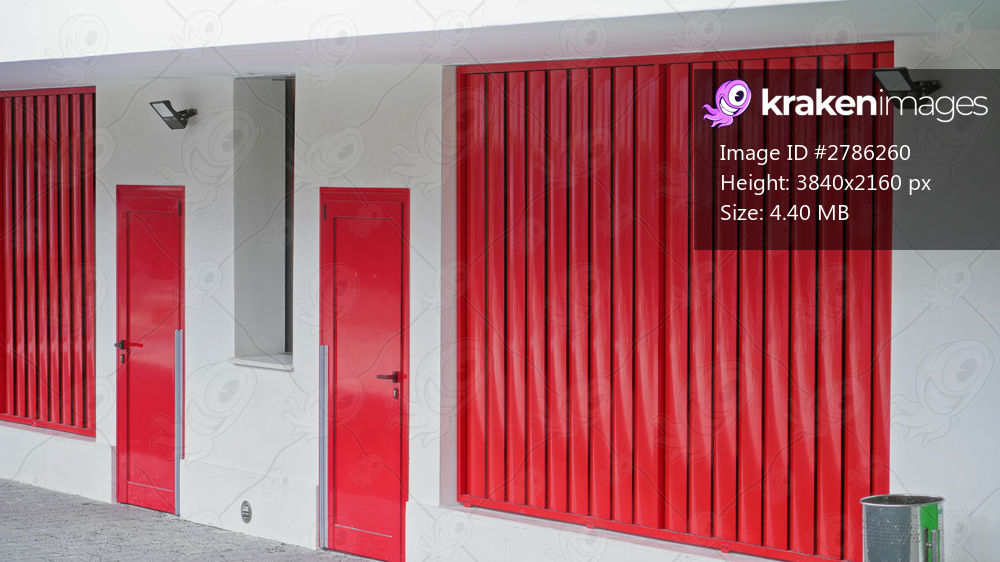 Colorful building exterior with vibrant red and blue doors under a bright sunny sky, showcasing modern design and urban architecture.
