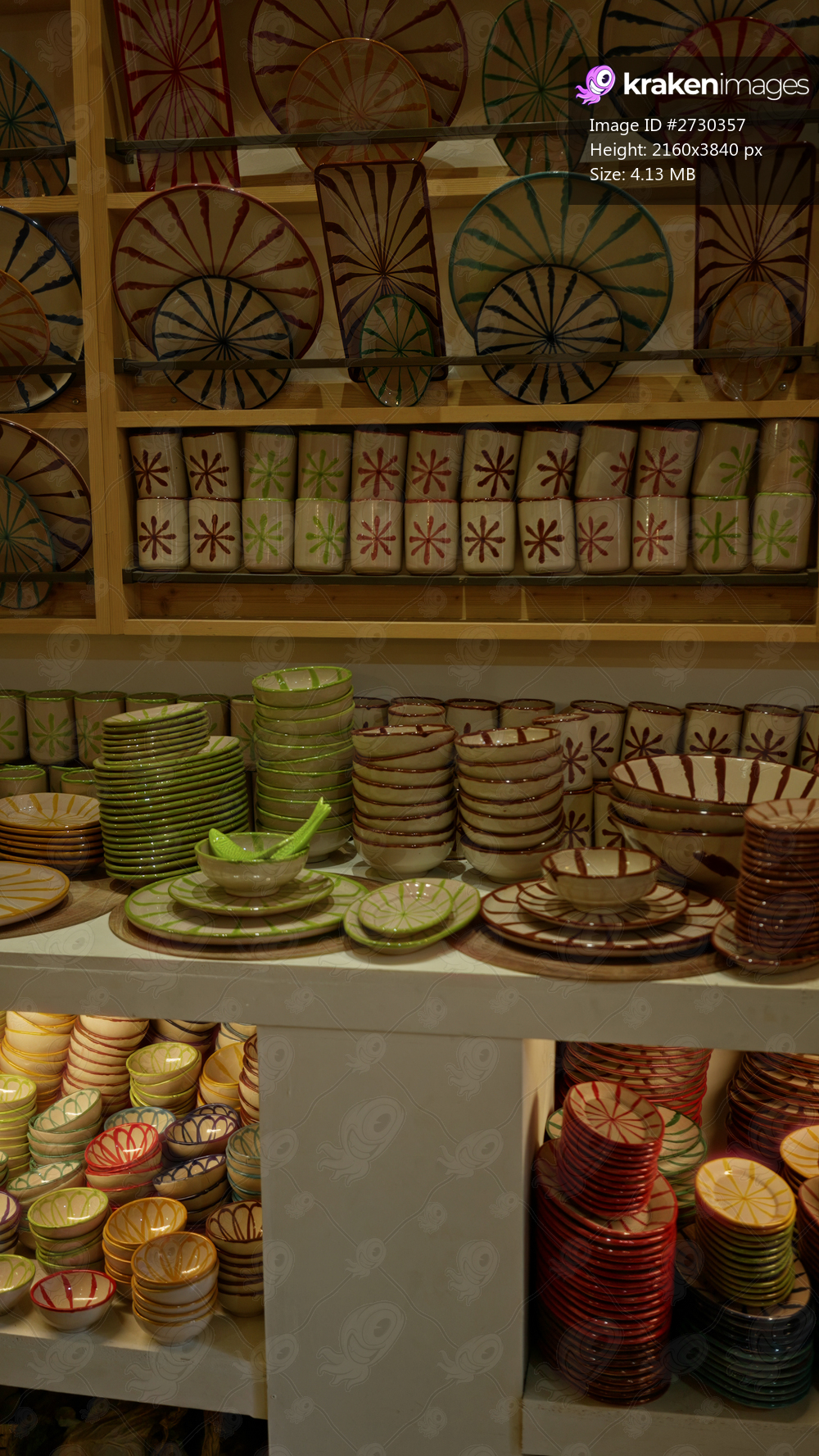 Colorful ceramics displayed in a pottery shop highlighting vibrant bowls, plates, and mugs arranged neatly on shelves, showcasing artisan craftsmanship and design. - Kraken Images