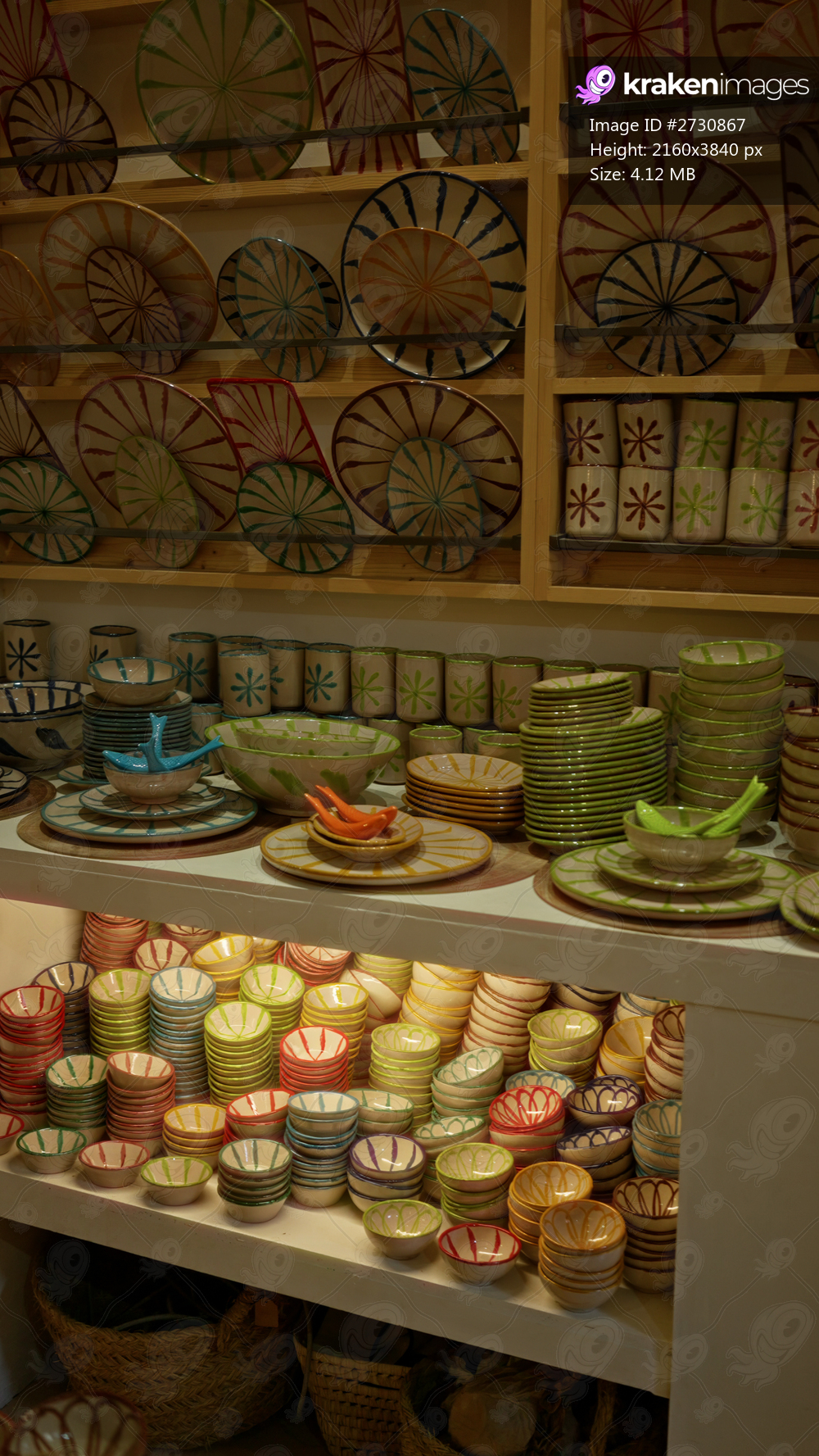 Colorful ceramics displayed in a pottery shop highlighting vibrant bowls, plates, and mugs arranged neatly on shelves, showcasing artisan craftsmanship and design. - Kraken Images