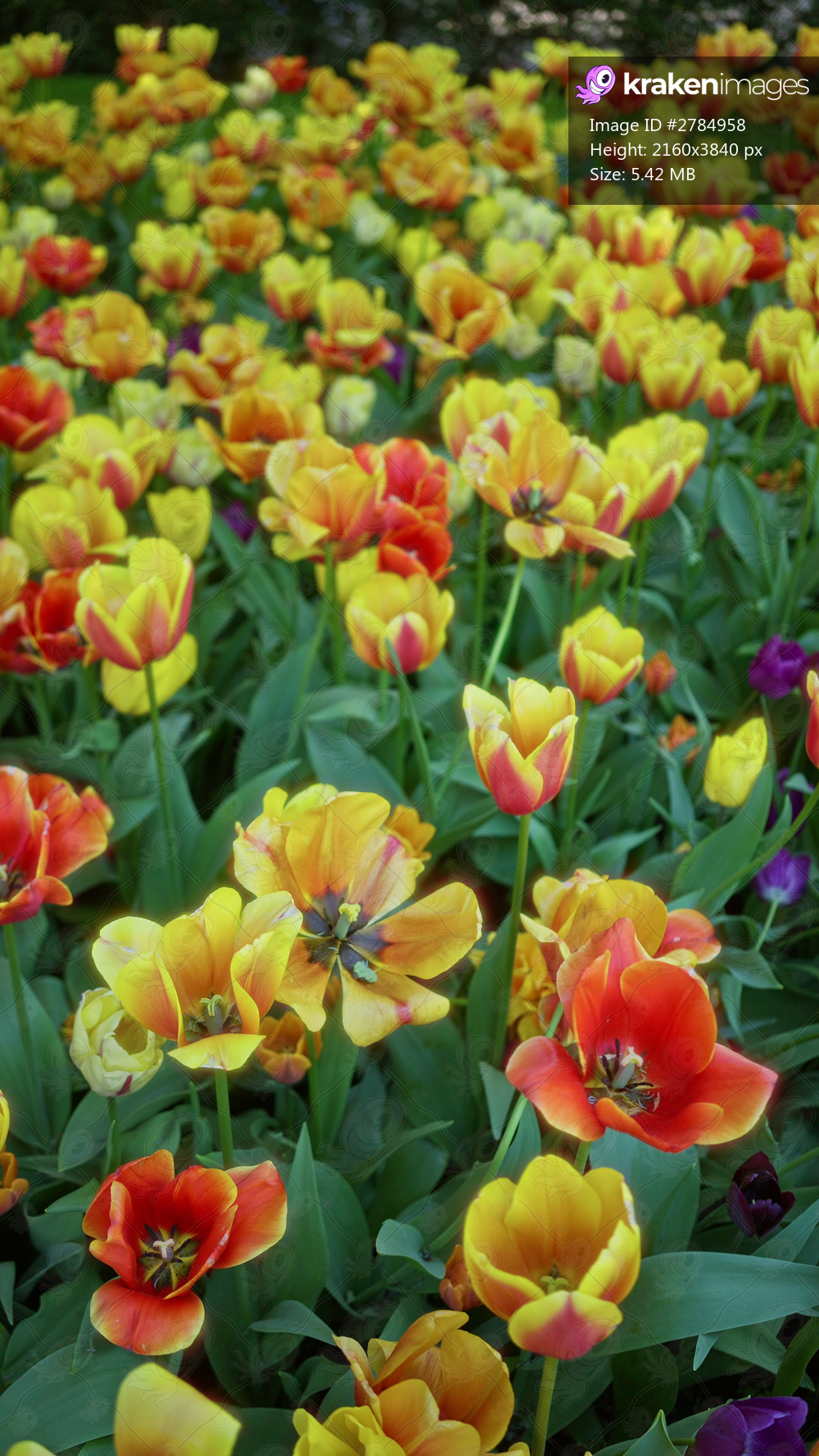 Colorful tulip field in full bloom with vibrant red, yellow, and orange flowers outdoors in the netherlands garden landscape.