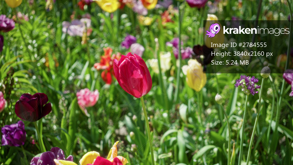 Colorful tulip garden in full bloom outdoors in the netherlands, showcasing vibrant red, yellow, and purple flowers amidst lush green foliage under a sunny sky. - Kraken Images