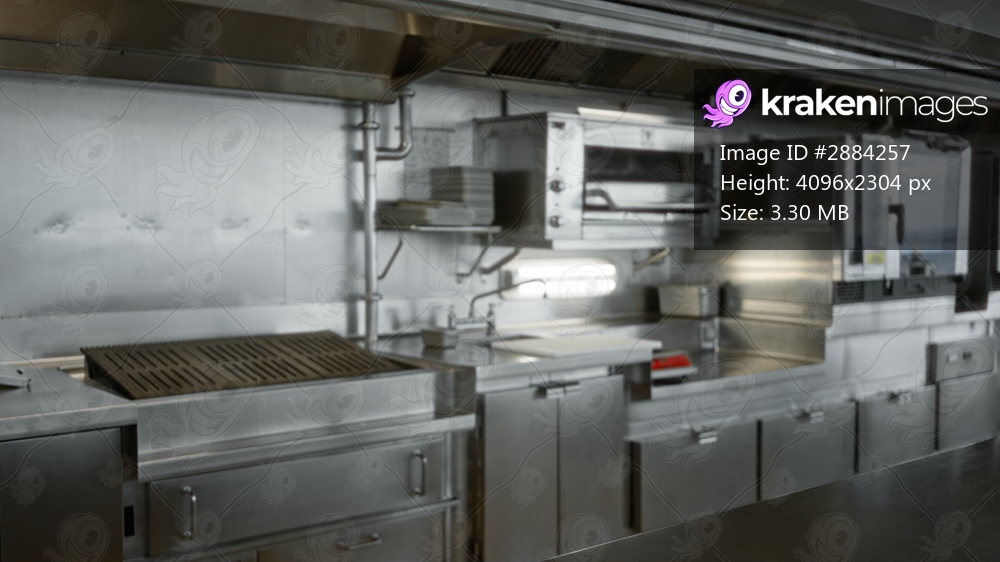 Commercial kitchen interior defocused stainless steel appliances and prep counters, blurred grill and extractor hood; background backplate copyspace template.