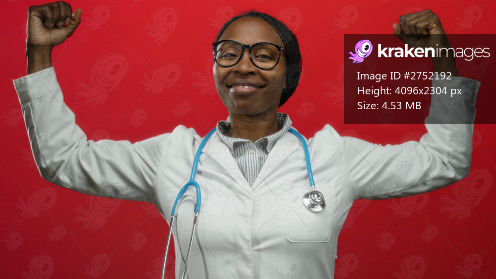 Confident female doctor smiling in lab coat with stethoscope posing against red background showcasing strength and empowerment in healthcare scene