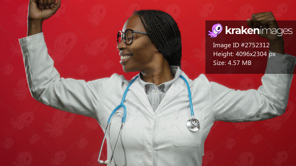 Confident female doctor smiling in lab coat with stethoscope posing against red background showcasing strength and empowerment in healthcare scene