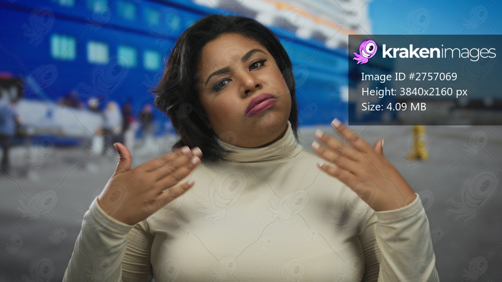 Confident hispanic woman at seaside port stands near a ship, gesturing expressively with her hands, conveying emotion and strength in an outdoor maritime setting. - Kraken Images