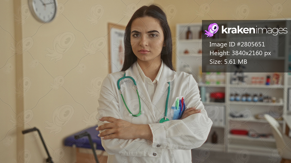 Confident hispanic woman doctor with stethoscope in uniform stands in clinic room crossed arms reflecting professionalism in a hospital interior environment - Kraken Images