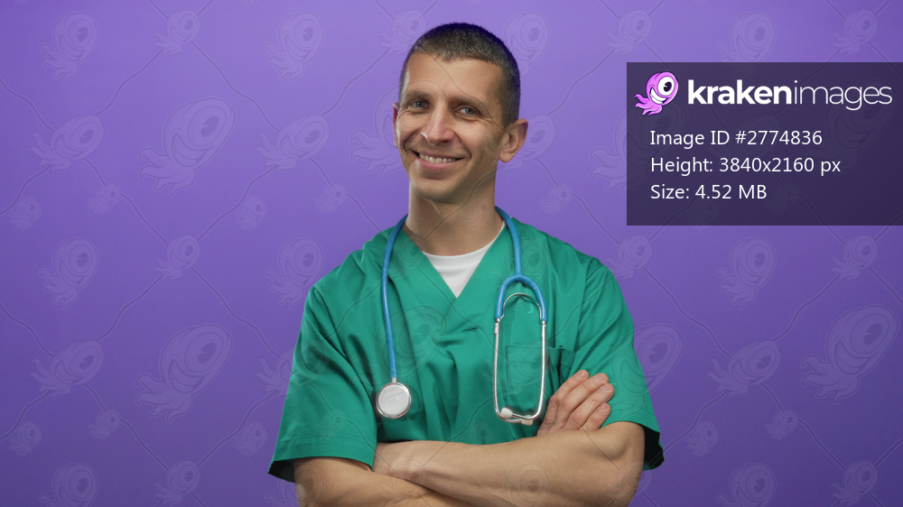 Confident man doctor with stethoscope, arms crossed, smiling against a purple wall as a symbol of medical professionalism and trust.