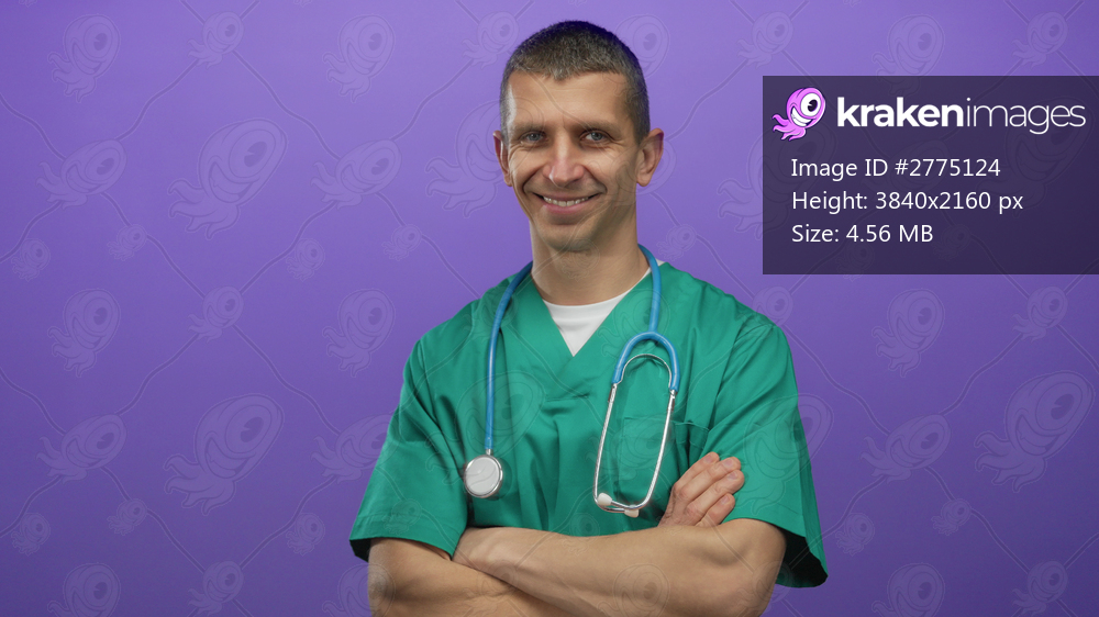 Confident man doctor with stethoscope, arms crossed, smiling against a purple wall as a symbol of medical professionalism and trust.