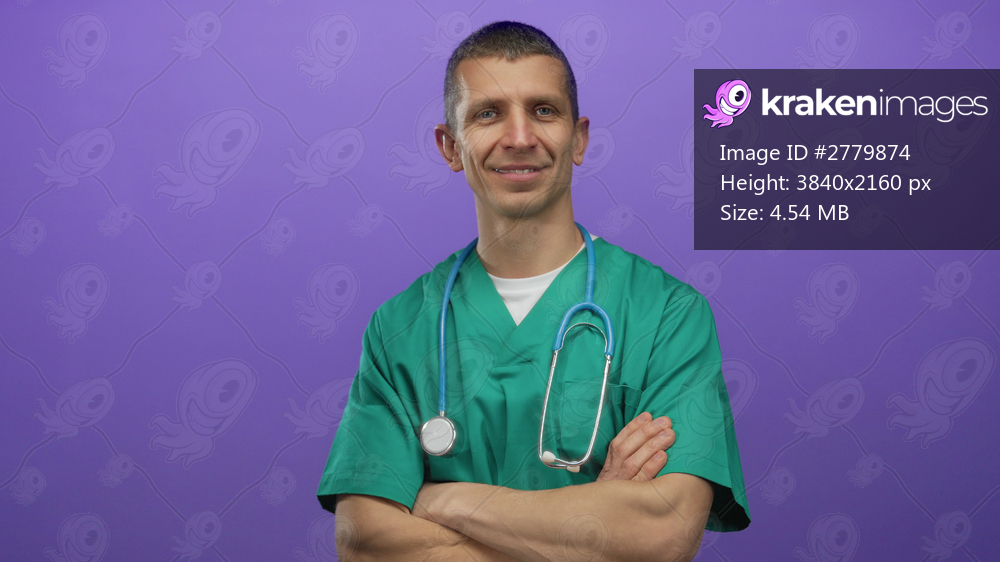 Confident man doctor with stethoscope, arms crossed, smiling against a purple wall as a symbol of medical professionalism and trust.