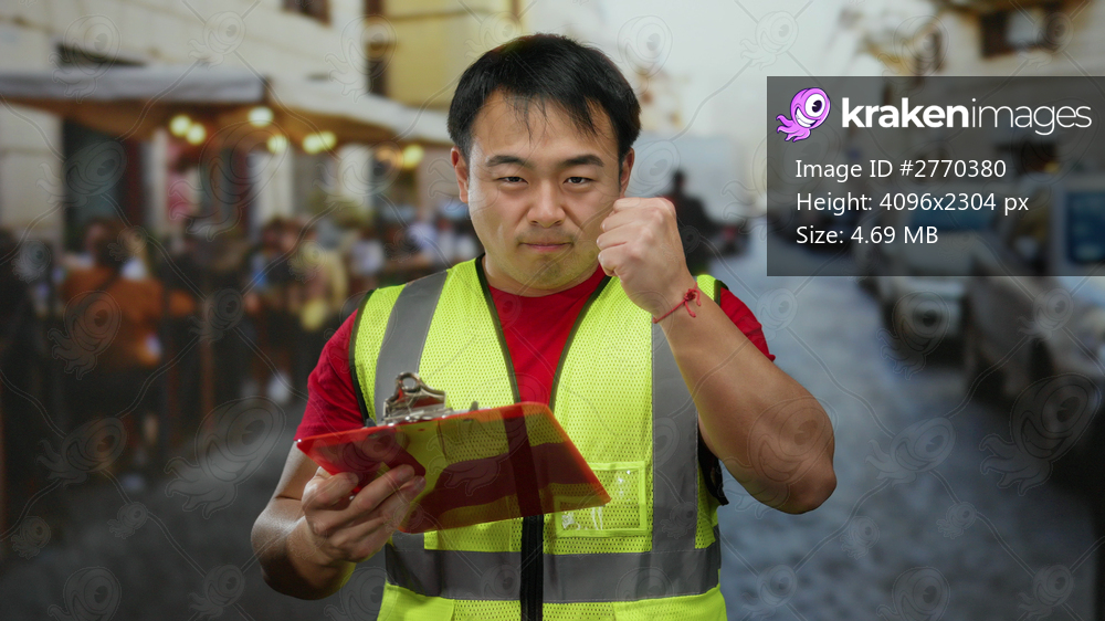Confident man in yellow vest holding clipboard standing on bustling outdoor street terrace with blurred cafe in urban city background