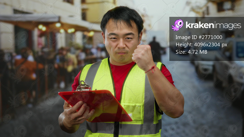 Confident man in yellow vest holding clipboard standing on bustling outdoor street terrace with blurred cafe in urban city background
