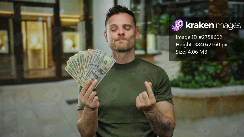 Confident man on urban street holding us dollars with cheerful expression and making heart gesture, exuding success and charm amidst a lively city atmosphere. - Kraken Images
