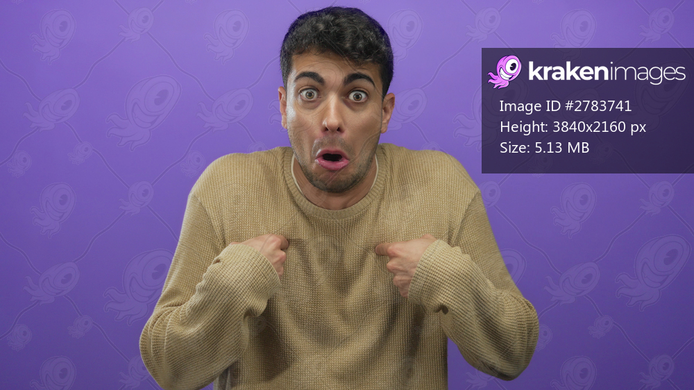 Confident man rests finger on chest and point self in front of a vibrant background where hispanic energy blends with young male gesture art inside a bright studio bathed in purple. - Kraken Images