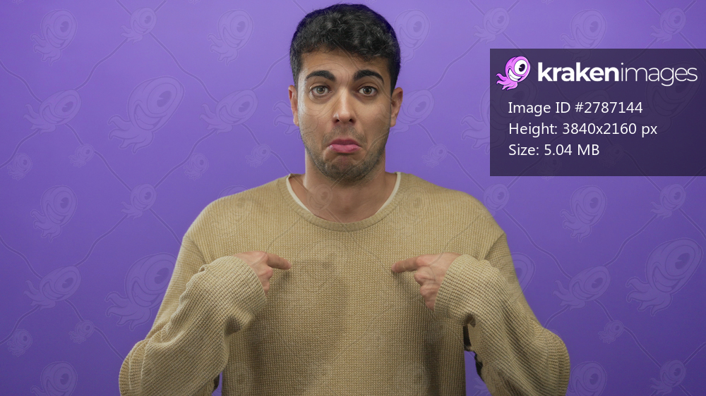 Confident man rests finger on chest and point self in front of a vibrant background where hispanic energy blends with young male gesture art inside a bright studio bathed in purple. - Kraken Images