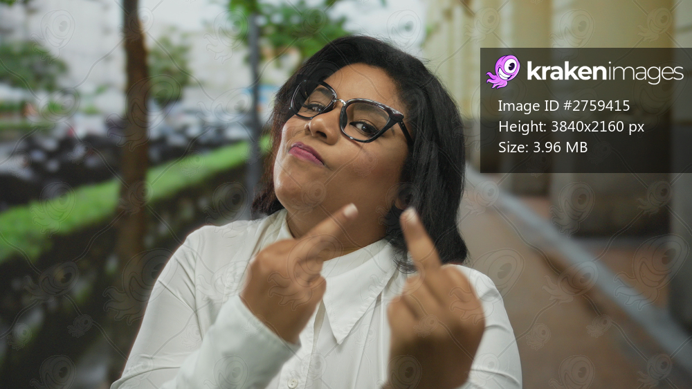 Confident plus-size hispanic woman in glasses expresses attitude with bold gesture on a busy city street with blurred urban background.