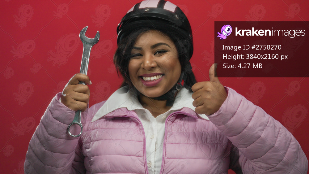 Confident plus size woman in helmet holding wrench and gesturing thumbs up against red wall, showcasing enthusiasm and readiness.