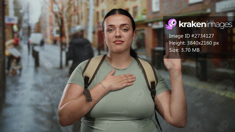 Confident woman with backpack making gesture on city street demonstrating empowerment and urban lifestyle in a dynamic outdoor setting.
