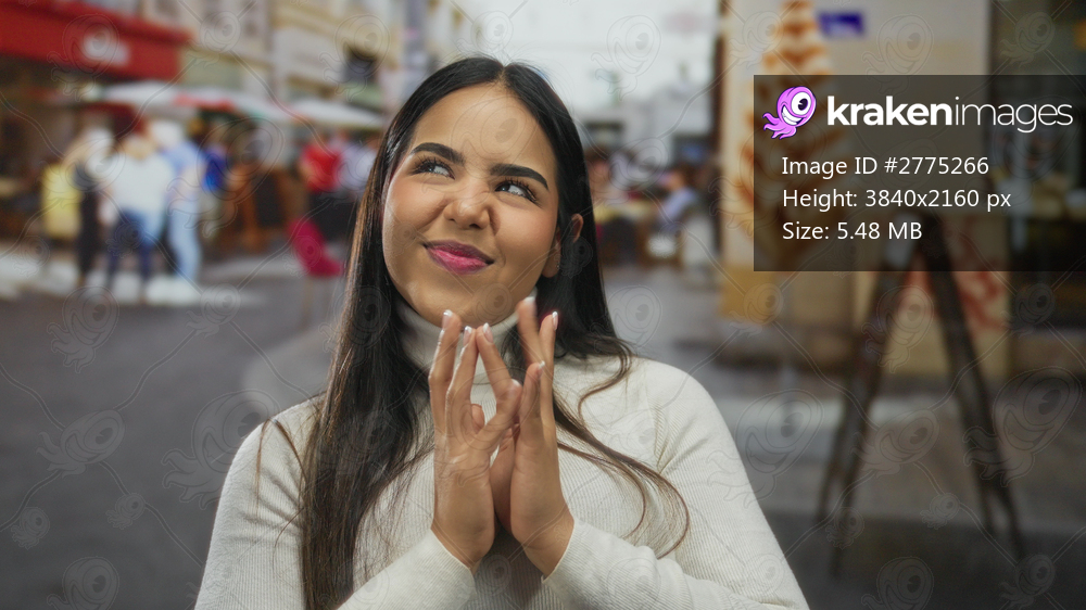 Confident woman brings her hands together while scheming on a lively street, where a young hispanic latin figure stands outdoors with a mischievous, smiling expression. - Kraken Images