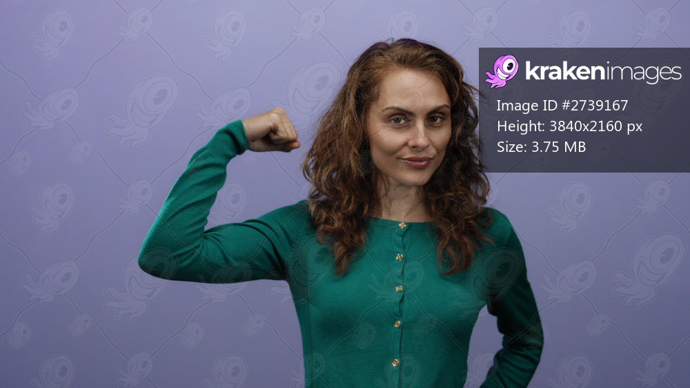 Confident woman with curly hair raising fist in empowerment pose against isolated purple wall wearing green sweater showing strength and determination