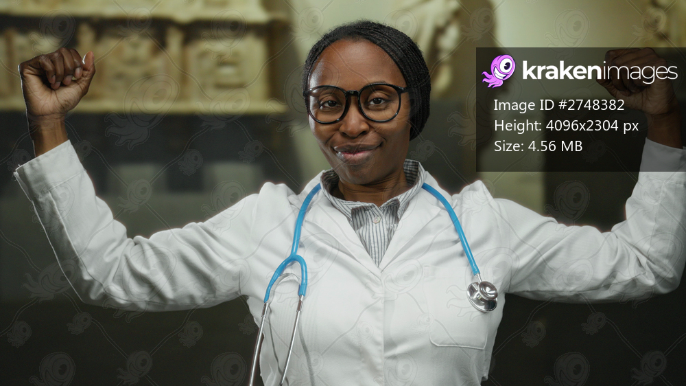 Confident woman doctor with stethoscope posing triumphantly in museum gallery indoor setting.
