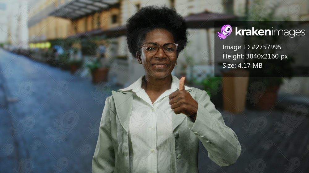 Confident woman in glasses gives thumbs up on city street, smiling proudly under sunny skies, expressing positivity outdoors with casual attire in urban environment. - Kraken Images
