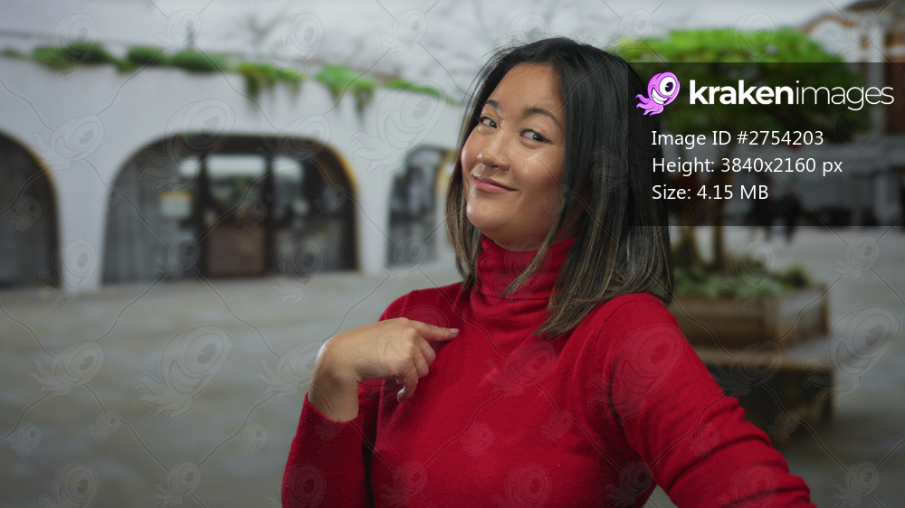 Confident woman in red sweater pointing to herself on city street, expressing pride and self-assurance in urban outdoor setting.