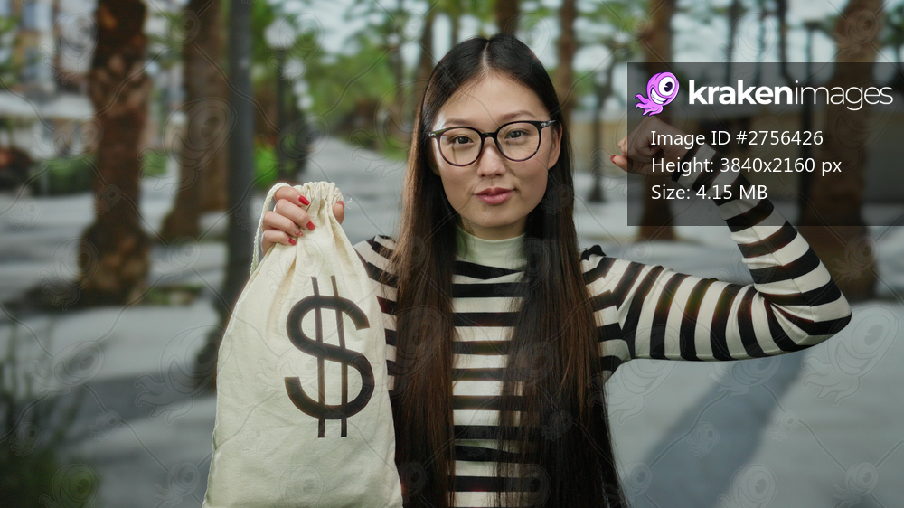 Confident woman in striped top holding dollar bag and flexing arm on urban street, showcasing strength and success.