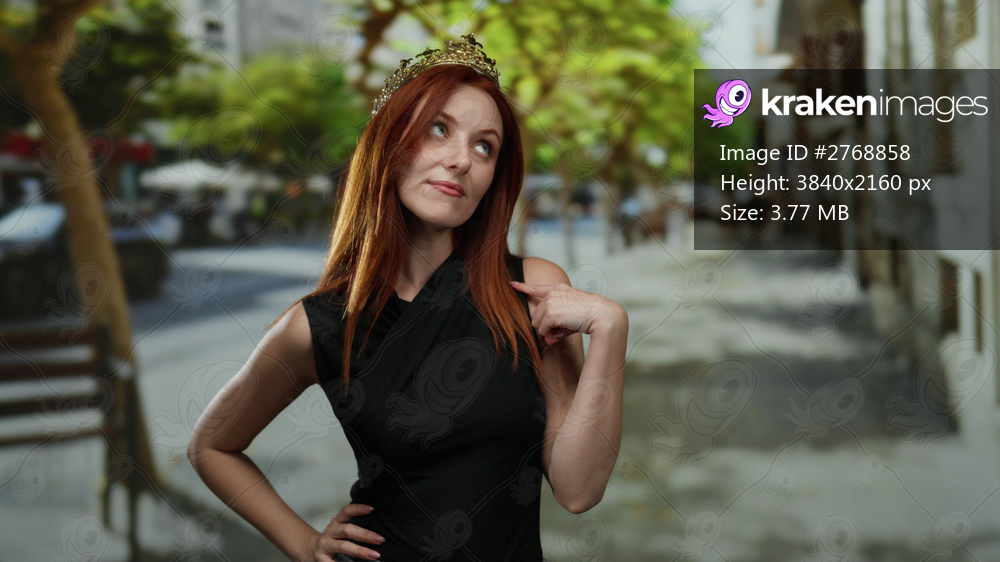 Confident woman with red hair wearing a crown stands outdoors in a vibrant city street, exuding beauty and charm, pointing playfully at herself with a subtle smile. - Kraken Images