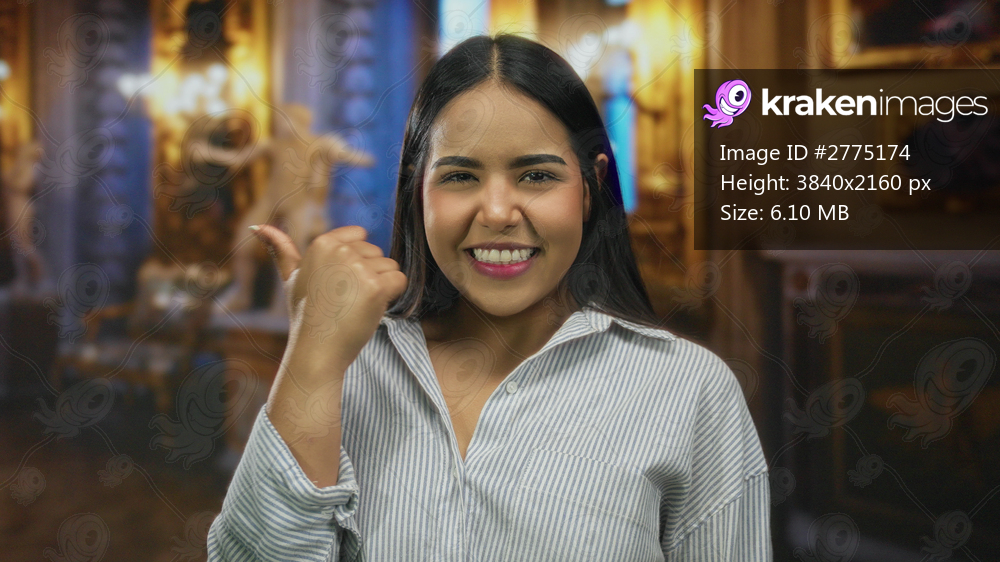 Confident woman shows a raised thumb while pointing at exhibits in a museum, as a young latin hispanic visitor poses for an indoor smile in the art gallery. - Kraken Images