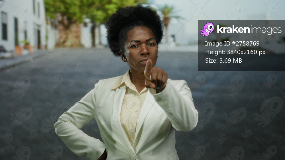 Confident woman standing with arms akimbo on a sunny city street wearing white jacket with blurred urban background suggesting empowerment and determination outdoors - Kraken Images