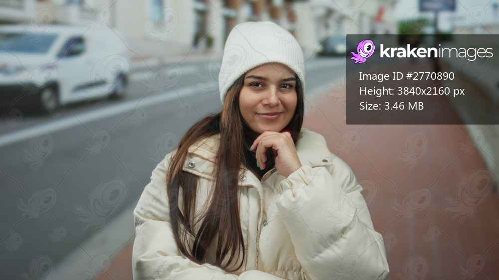 Confident woman wearing white jacket and beanie smiles on urban street with blurred buildings and moving cars emphasizing warmth and modern style