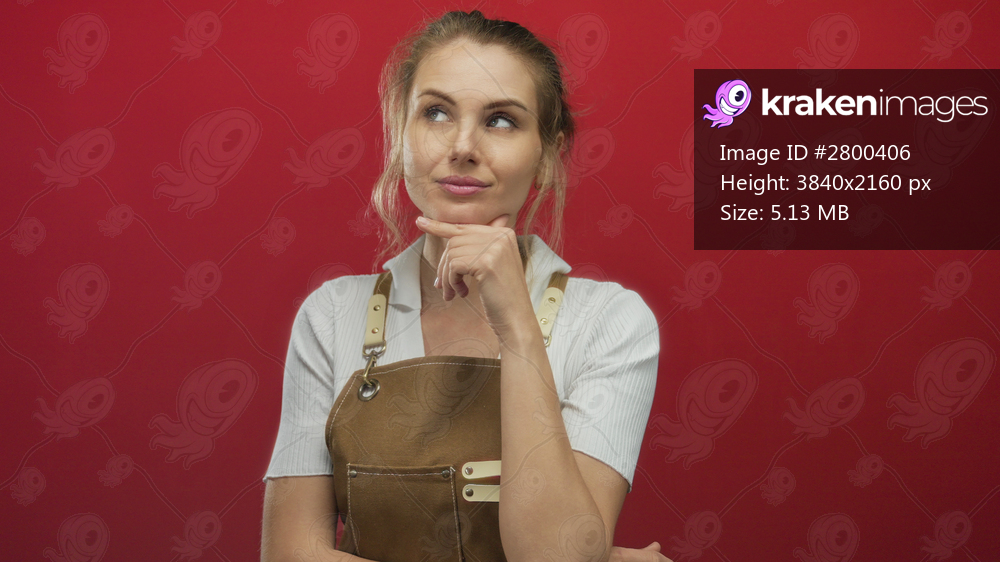 Confident young blonde woman in an apron stands pensively against a bold red background, embodying creative contemplation and professional elegance.