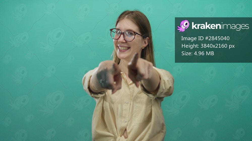 Confident young blonde woman points two fingers directly toward the camera in studio; invitation connection.
