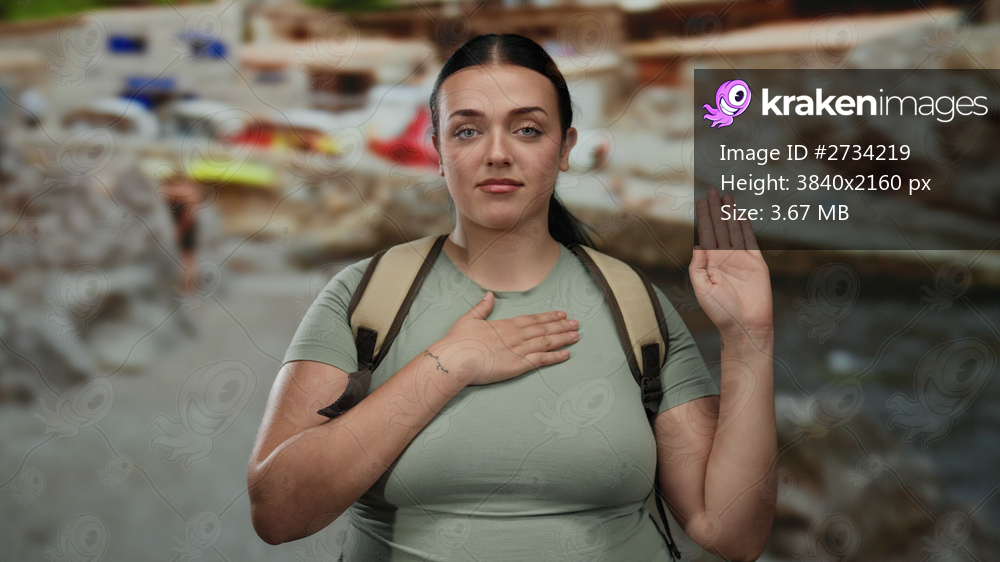 Confident young woman with backpack standing on a picturesque beach, captured mid-gesture, with a stunning seaside view in the background, enjoying a peaceful outdoor experience. - Kraken Images