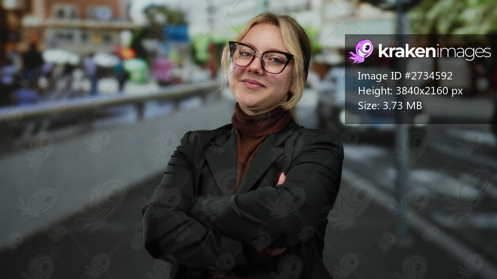 Confident young woman with blonde hair and glasses stands on a bustling city street terrace, arms crossed, wearing a black blazer in an outdoor urban setting. - Kraken Images
