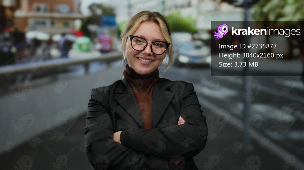 Confident young woman with blonde hair and glasses stands on a bustling city street terrace, arms crossed, wearing a black blazer in an outdoor urban setting. - Kraken Images
