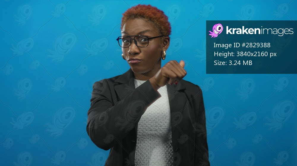 Confident young woman wearing glasses and blazer pointing finger to eyes in a bright blue studio; vigilance alertness focus watchfulness.