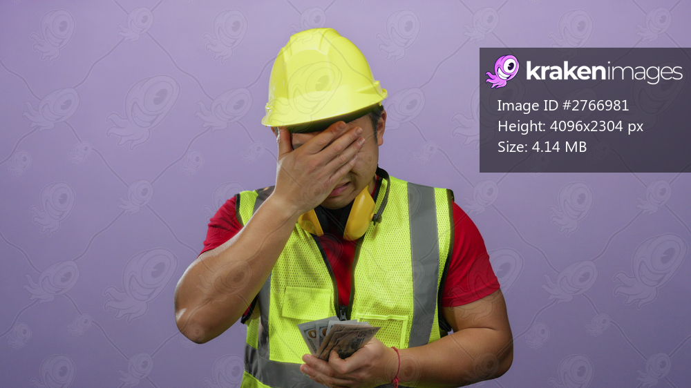 Construction worker counting dollar bills over purple background wearing safety vest and hard hat, suggesting an industrial or financial context with an isolated focus - Kraken Images