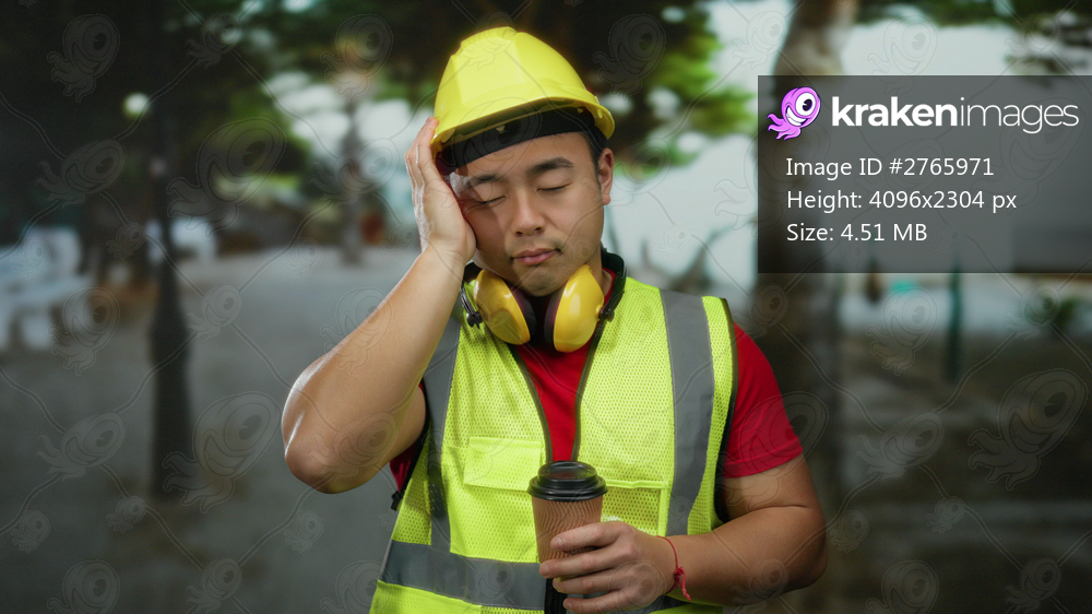 Construction worker holding coffee on urban street wearing hardhat headphones and safety vest in city setting with a tired expression.