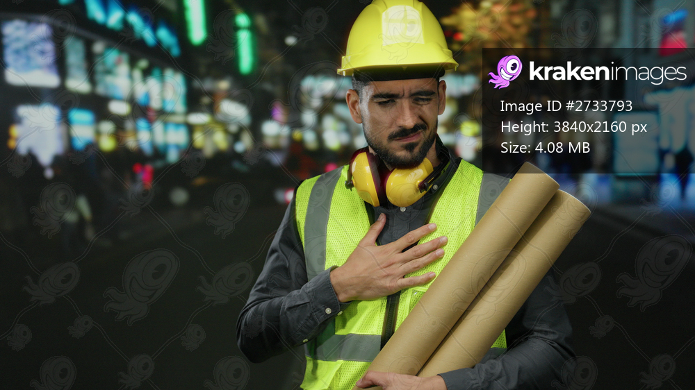 Construction worker man in urban street wearing safety gear and holding blueprints while coughing, suggesting health concern in night city setting with blurred lights. - Kraken Images
