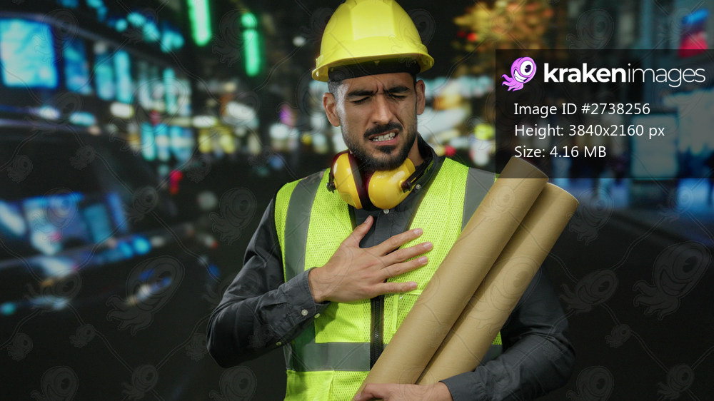 Construction worker man in urban street wearing safety gear and holding blueprints while coughing, suggesting health concern in night city setting with blurred lights. - Kraken Images