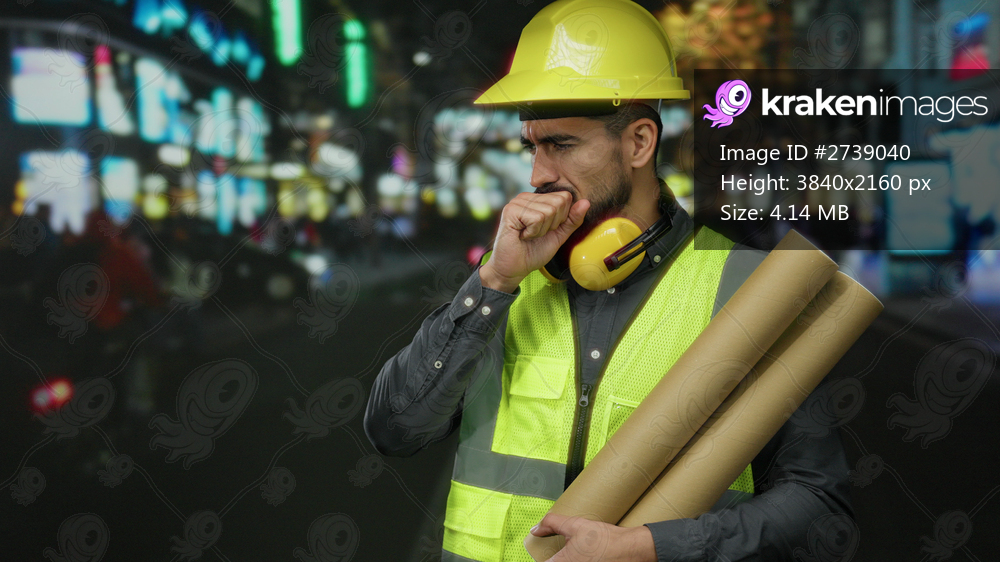 Construction worker man in urban street wearing safety gear and holding blueprints while coughing, suggesting health concern in night city setting with blurred lights. - Kraken Images