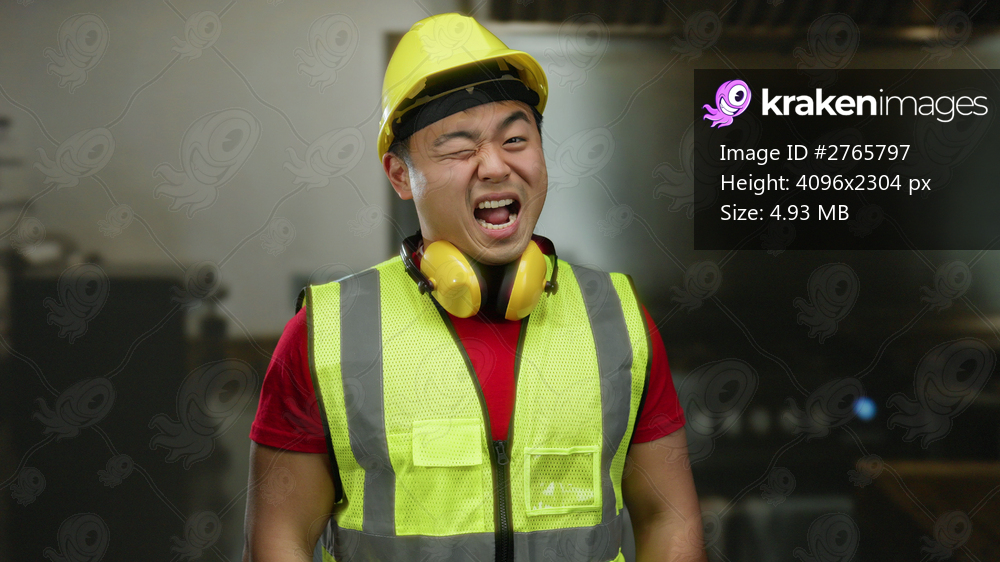 Construction worker smiling indoor wearing safety helmet and vest in industrial setting with protective ear gear highlighting asian male energy and professionalism. - Kraken Images