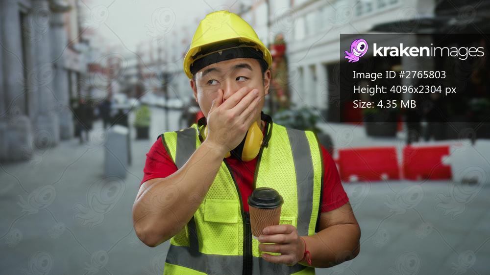 Construction worker yawning outdoors in city street holding coffee wearing hard hat and safety vest.