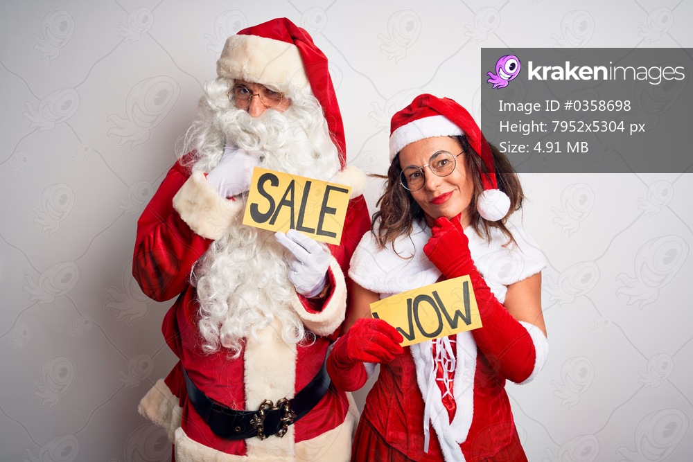 Couple wearing Santa costume holding wow and sale banner over isolated white background looking confident at the camera smiling with crossed arms and hand raised on chin. Thinking positive. - Kraken Images