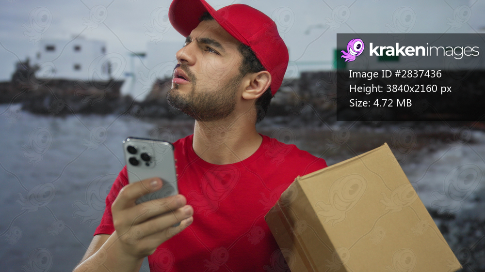 Courier in red cap looks upward with focused expression while holding smartphone and cardboard box at building facade; dedication.