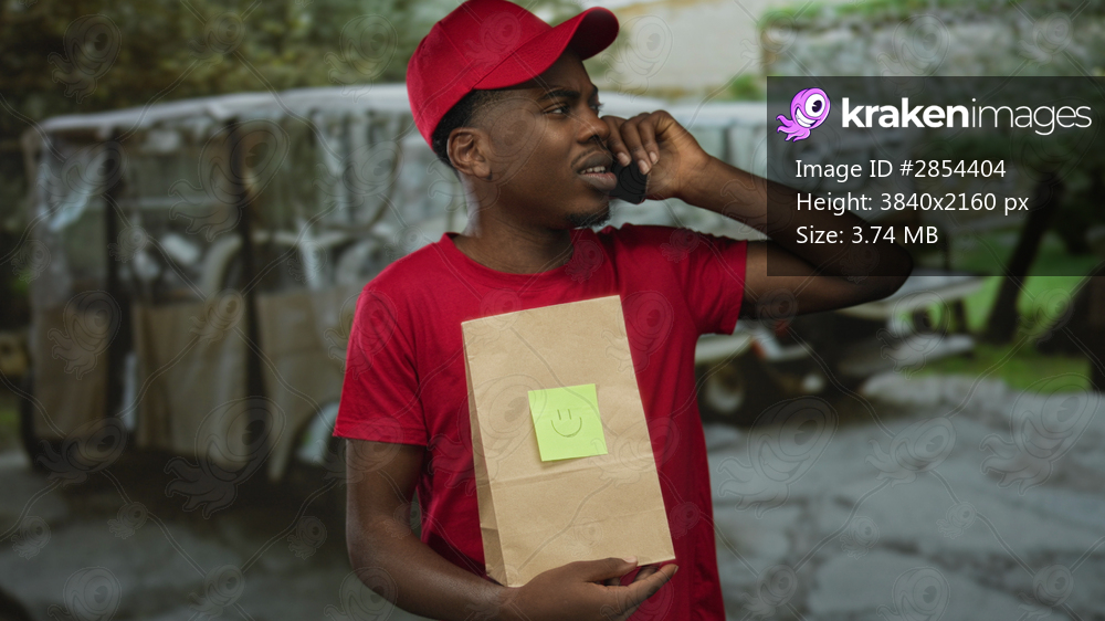 Courier man holds phone to ear while gripping brown paperbag with smiley note in sunlit green park; duty.
